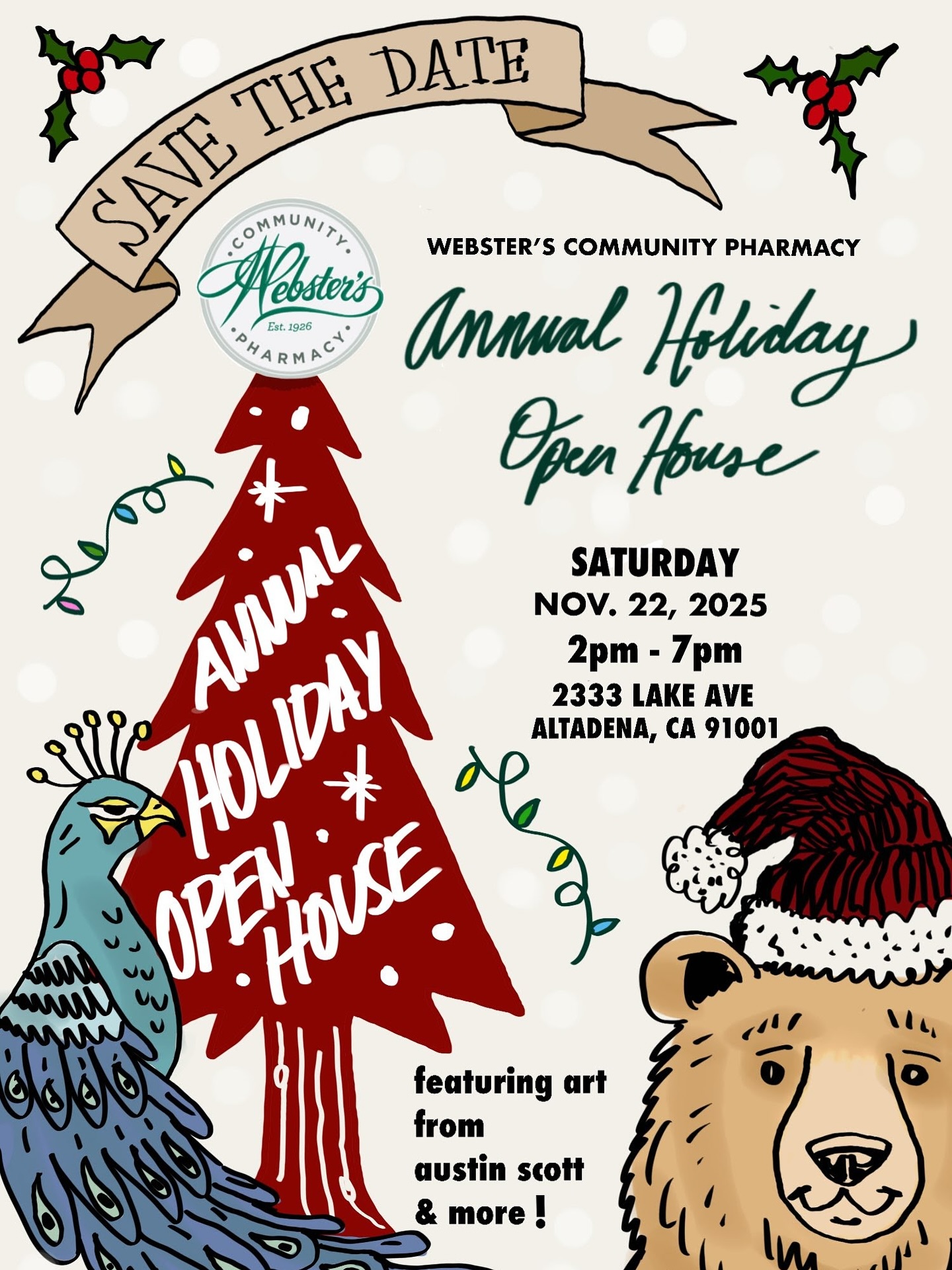 🎁 Holiday Open House: Sip eggnog, enjoy treats, and browse a sparkling selection of seasonal gifts at Webster’s Community Pharmacy — with artist Austin Scott on hand to celebrate his “Holiday Greetings from Altadena” collaboration. Plus complimentary gift wrap and a festive gift basket drawing. Saturday, November 22 from 2PM–7PM.